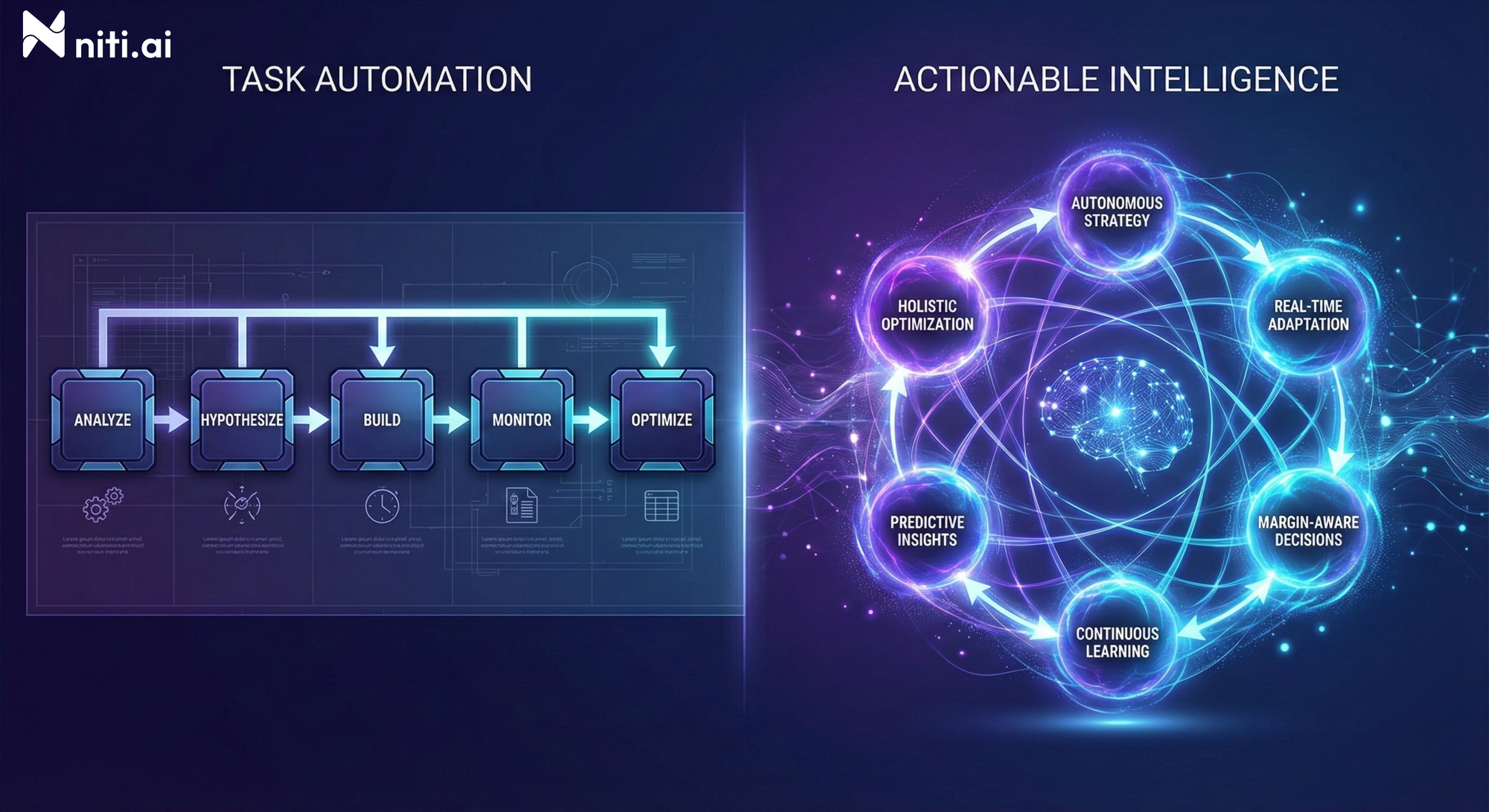 Traditional platforms require you to orchestrate everything manually. With Niti AI, you set business objectives and margin constraints once, then the system operates autonomously. It's the difference between conducting an orchestra note-by-note versus hiring a conductor who knows the entire symphony.