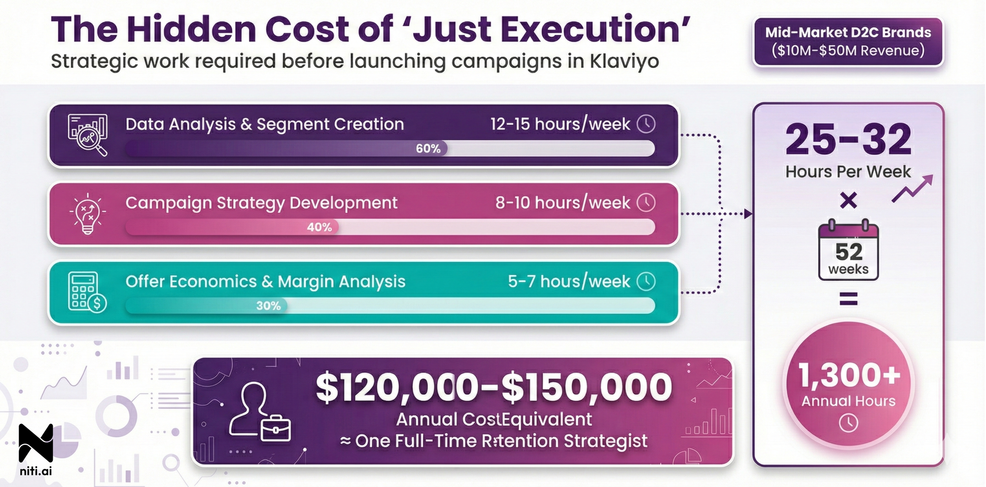 That's 1,300+ hours annually—roughly the cost of a $120,000-150,000 retention strategist—just to make Klaviyo valuable.