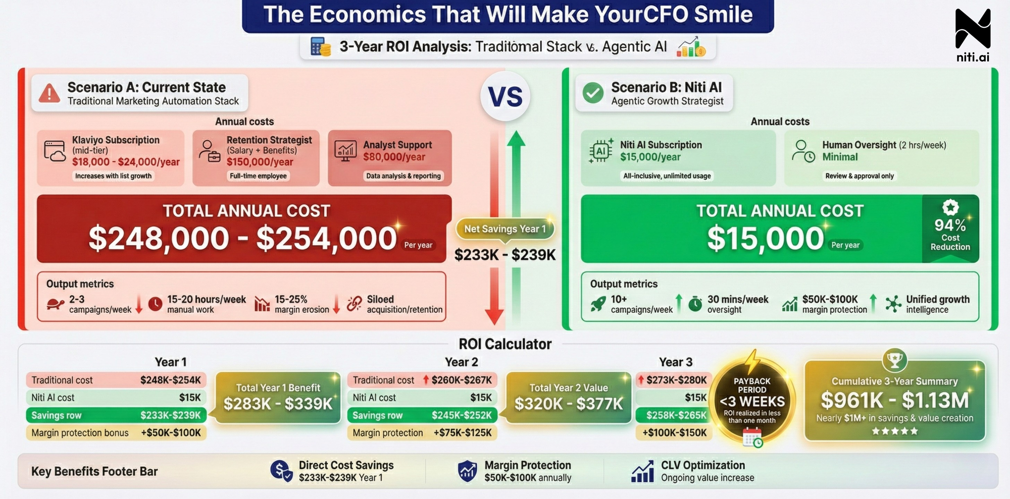Niti AI isn't "Klaviyo with AI features." It's an entirely different architecture designed to replace human strategic work, not assist it.